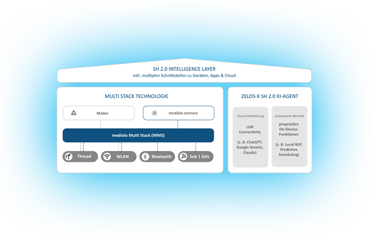 Ein zentraler USP ist der Intelligence Layer mit Multi-Stack-Architektur (Sub-1 GHz, Thread, Bluetooth, WiFi), der Matter-Konnektivität bietet und gleichzeitig Rückwärtskompatibilität zu den millionenfach verbauten Bestandsprodukten mit Sub 1 GHz-Funk bietet. Zelos-X erweitert diesen Layer um einen leistungsfähigen KI-Agenten mit Schnittstellen zur Verbindung mit führenden cloudbasierten KI-Systeme wie z.B. Google Gemini oder mit lokalen KI-Varianten.